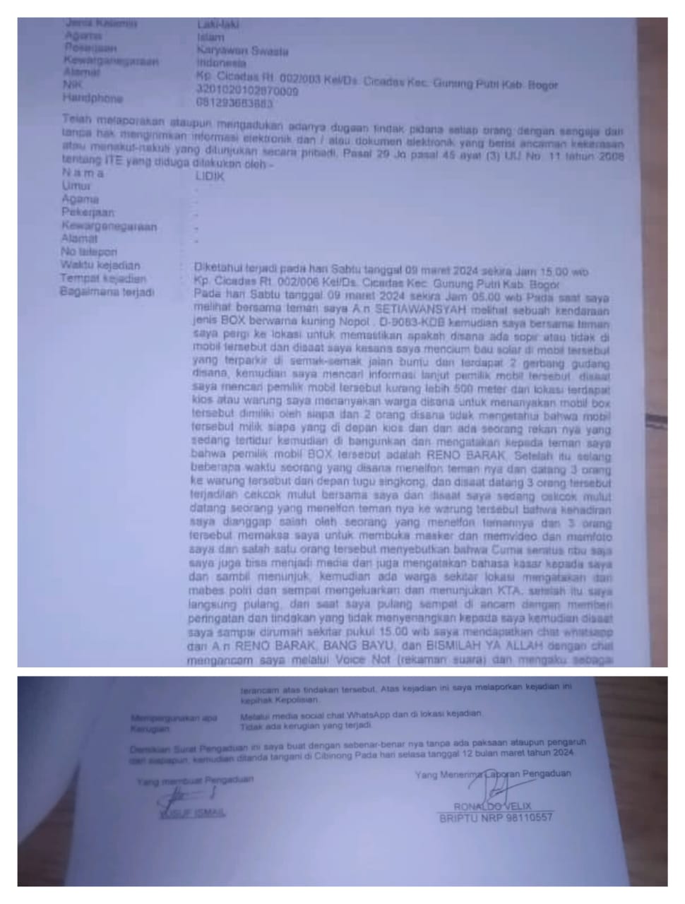 “Iya betul hari ini saya bersama teman telah mengadukan hal ini ke polres Bogor”, ujarnya Selasa (12/3/2024) usai membuat laporan.
