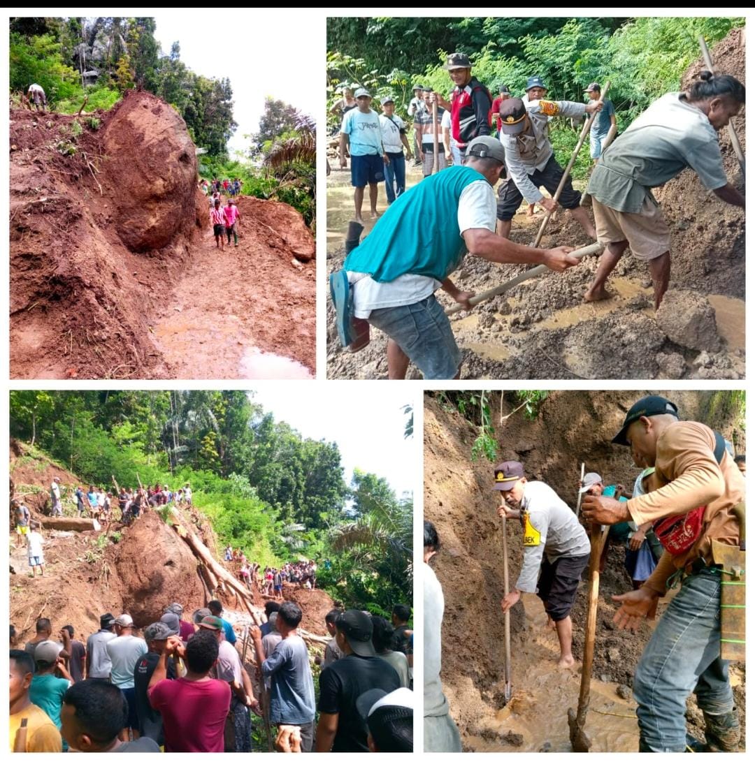 Labuan Bajo, Global investigasi News, com-Polisi dari Polsek Kuwus, Polres Manggarai Barat bersama unsur pemerintah kecamatan dan warga bahu membahu membersihkan material longsor di Kecamatan Kuwus Barat, Kabupaten Manggarai Barat, Nusa Tenggara Timur (NTT) agar akses yang terputus bisa kembali dilalui.