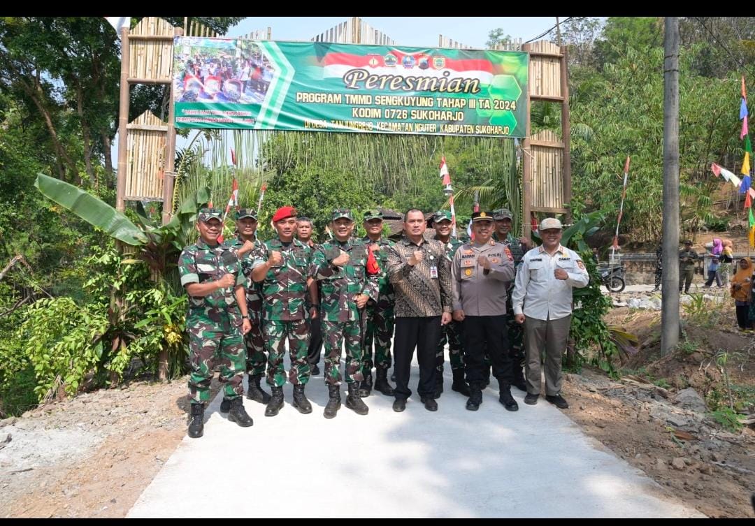 Sukoharjo (22/08/24) TMMD Sengkuyung Tahap III Kodim 0726/Sukoharjo di desa Tanjungrejo, Kecamatan Nguter, Kabupaten Sukoharjo yang dibuka sejak tanggal 24 Juli 2024, hari ini Kamis (22/08/24) resmi ditutup oleh Dandim 0726/Sukoharjo Letkol Czi Slamet Riyadi, S.E. yang bertindak selaku Inspektur Upacara dengan tema “Darma Bakti TMMD Mewujudkan Percepatan Pembangunan di Wilayah”.