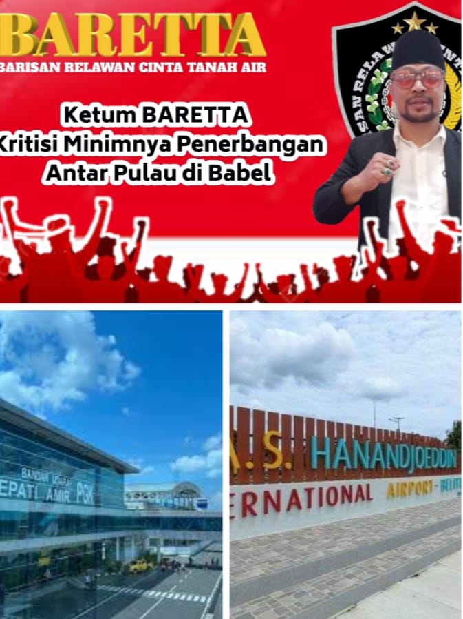 Pangkalpinang – Minimnya penerbangan udara antar pulau di Provinsi Kepulauan Bangka Belitung (Babel) menjadi sorotan Ketua Umum Ormas BARETTA, Armansyah, S.S., S.H. Dalam keterangannya pada Rabu(18/12/2024), ia meminta Penjabat Gubernur Babel untuk segera menambah jumlah penerbangan dari Bandara Depati Amir (PGK) di Pulau Bangka ke Bandara H.A.S. Hanandjoeddin (TJQ) di Pulau Belitung, atau sebaliknya.