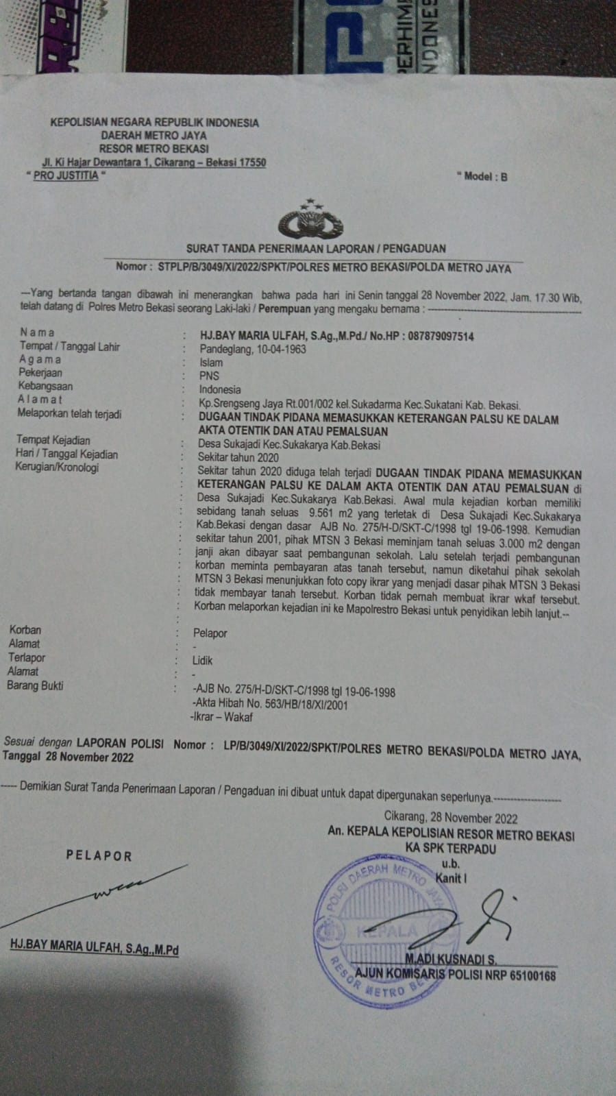 Laporan tersebut diajukan oleh Hj. Bay Maria Ulfah, yang mengaku sebagai korban dugaan pemalsuan dokumen dan tanda tangan sebagaimana diatur dalam Pasal 266 dan 263 KUHP.