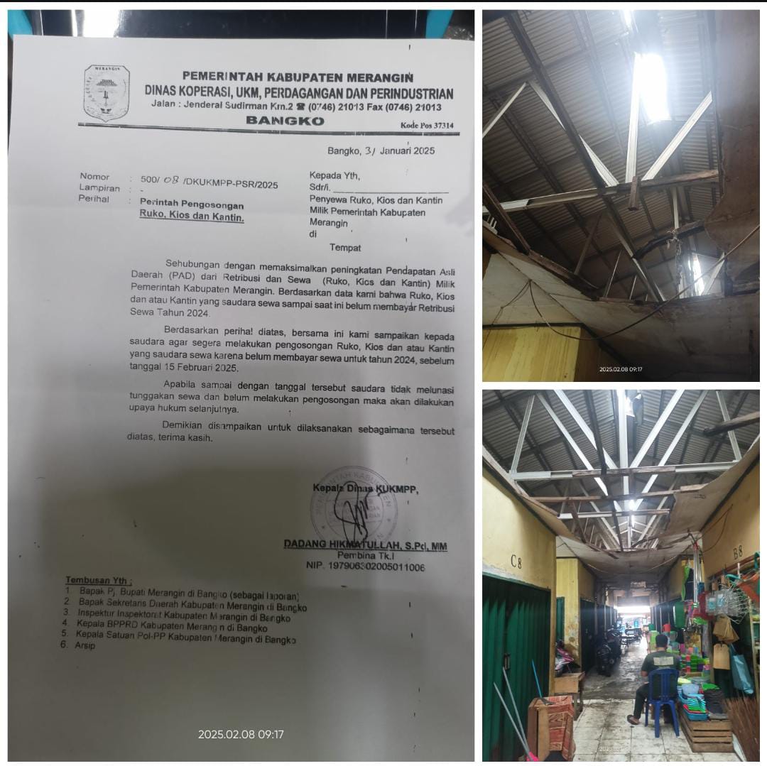 Karena pemberitahuan yang di sampaikan oleh petugas UPTD Pasar juga belum di bayar,maka Pemda memberikan surat pemberitahuan,yang bunyinya apabila tidak membayar tunggakan sewa Kios,Ruko dan kantin 2024 hingga tanggal 15 Pebruari 2025,agar mengosongkan Kios yang di tempatinya.