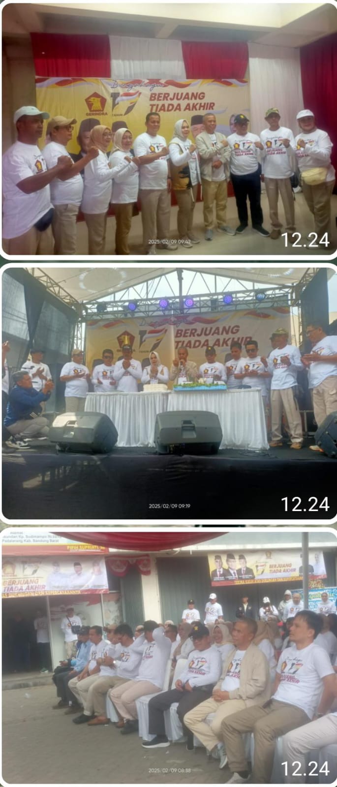 Oh yang mana gerinda sekarang sudah menginjak usia 17 tahun, Saya berharap” semoga partai Gerindra semakin Jaya dan tentunya di kegiatan hari ini di acara ulang tahun ini kita, mengadakan bakti sosial, dan memberikan bantuan santunan pada ,anak yatim juga pada lansia. tentunya hari ini juga kita dihadiri oleh wakil bupati terpilih kita Bapak Haji Asep Ismail dan beliau sekarang sudah menjadi kader partai Gerindra.