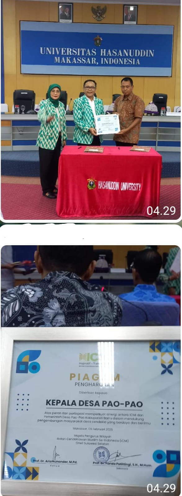 Pemerintah Desa Pao-Pao Kecamatan Tanete Rilau Kabupaten Barru, melakukan Penandatanganan Kerjasama pada pemberdayaan masyarakat desa khususnya bidang ekonomi dan pengembangan mssyarakat desa cendekia yang berdaya dengan ICMI Orwil Sulsel yang berlangsung di Universitas Hasanuddin Makassar, (9/2/25).