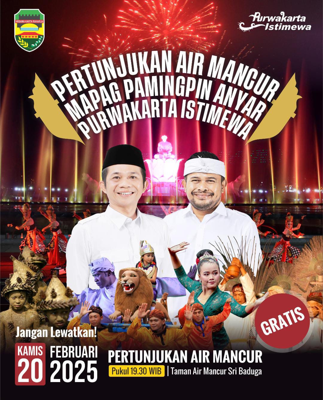 Pertunjukan Air Mancur Sri Baduga yang terkenal bisa ‘menari’ itu akan beroperasi setelah Saepul Bahri Binzein-Abang Ijo Hapidin menjalani serah terima jabatan dari Pj Bupati Purwakarta Benni Irwan lalu rapat paripurna di DPRD Purwakarta pada hari Kamis (20/02/2025).