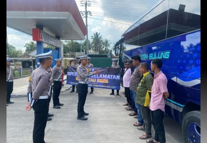 Satlantas Polres Way Kanan Intensifkan kegiatan sosialisasi dan peneguran kepada pengguna jalan dalam rangka Operasi Keselamatan Krakatau 2025 di Jalan Lintas Sumatera Kampung Bumi Ratu Kecamatan Umpu Semenguk Kabupaten Way Kanan. Sabtu (22/02/2024).