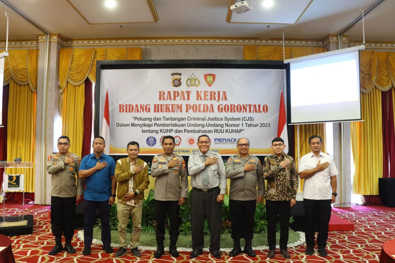 Wakil Kepala Kepolisian Gorontalo Brigjen Pol Simson menghadiri sekaligus membuka Raker Bidkum T.A 2025 dengan teman “Peluang dan tantangan CJS (Criminal Justice Sistem) atau Sistem Peradilan Pidana dalam menyikapi Pemberlakuan UU Nomor 1 Tahun 2023, serta Pembahasan RUU KUHAP” bertempat di Hotel Grand Q. Selasa (25/02)