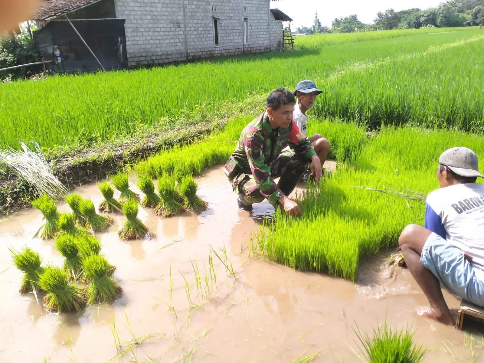 Babinsa Serma Pujiyanto yang tak segan untuk terjun langsung ke sawah, membantu para petani untuk mengumpulkan bibit padi yang siap untuk ditanam di lahan milik anggota Poktan Ngundi Luhur.
