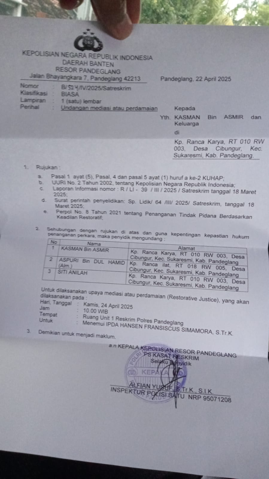 PANDEGLANG, – Mediasi antara Pelapor lewat kuasa hukumnya dengan kuasa hukum terlapor di Polres Pandeglang, pada Kamis, 24 April 2025 tidak menemukan titik temu alias deadlock.