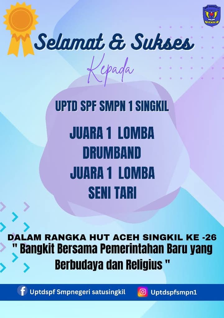 “Kemenangan SMPN 1 Singkil dalam perlombaan Drumbend dan Seni Tari adalah karena kesungguhan anak – anak dalam berlatih dan didukung oleh Seluruh Guru pelatih dan pendamping juga keluarga besar SMPN 1 Singkil, kami akan terus berlatih dan berlatih agar menjadi yang terbaik pada lomba drambend dan Seni Tari di tingkat provinsi nantinya, Aamiin,” tuturnya (Sabri)