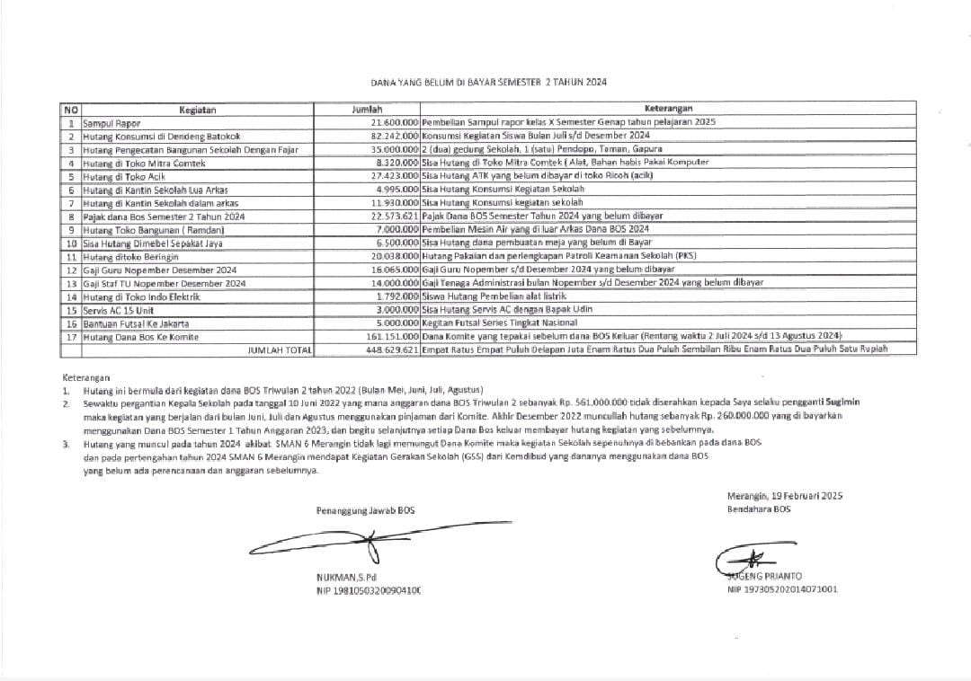 Berdasarkan penelusuran awak media dan data yang berhasil didapat bahwa masih banyak hutang dengan rekanan di SMAN 6 Merangin yang pada Tahun 2024 belum dibayarkan, tidak tanggung-tanggung, hutang tersebut mencapai lebih dari Rp. 448 juta-an.