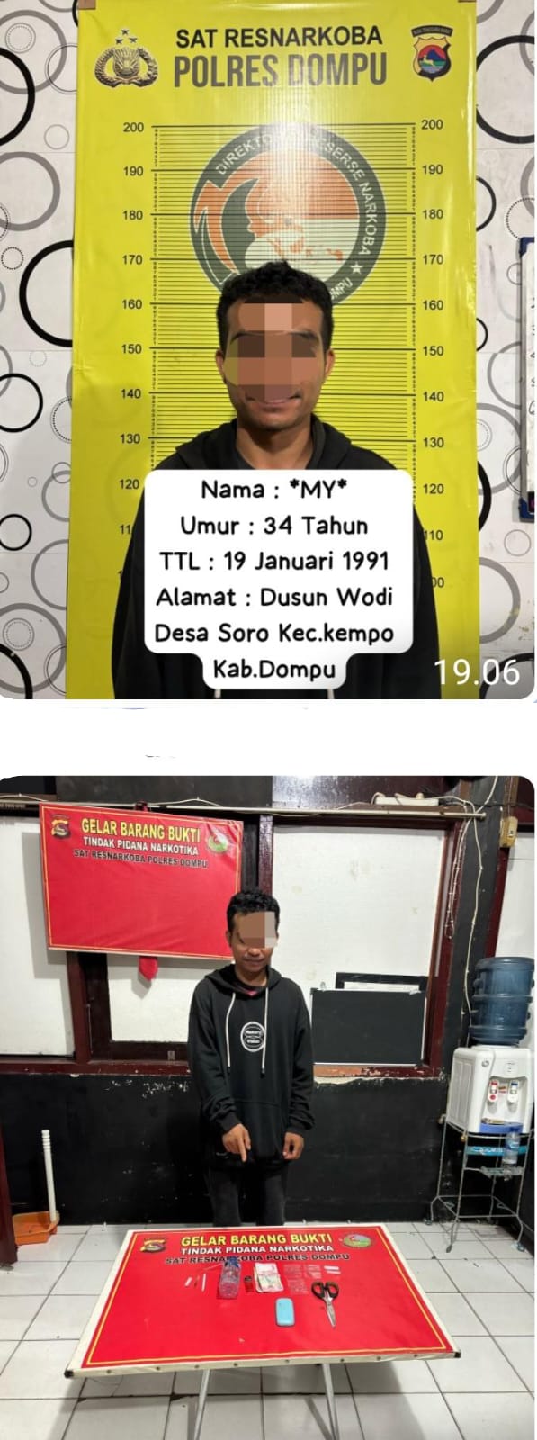 Tim Opsnal Satresnarkoba Polres Dompu kembali menggulung seorang pria berinisial MY, warga Dusun Wodi, Desa Soro, Kecamatan Kempo, Kabupaten Dompu, di duga sebagai pengedar dan atau penyalahgunaan narkotika jenis sabu, pada Jumat (9/5/2025) sekitar pukul 17.30 WITA.