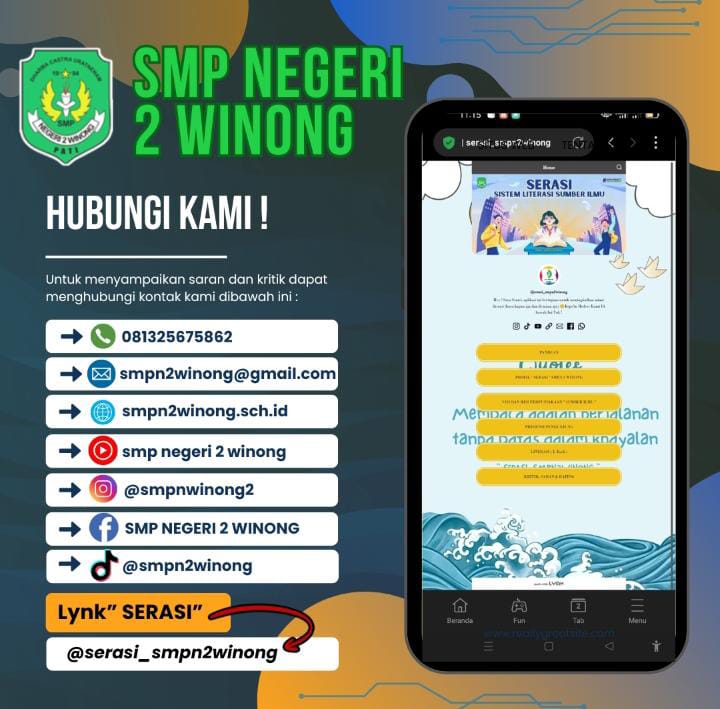 SMP Negeri 2 Winong dengan bangga mengumumkan peluncuran “SERASI” (Sistem Literasi Sumber Ilmu). Inisiatif ini merupakan bagian dari komitmen sekolah untuk memanfaatkan teknologi dalam mendukung kegiatan belajar mengajar serta memperluas akses informasi bagi siswa, guru & orang tua/masyarakat.