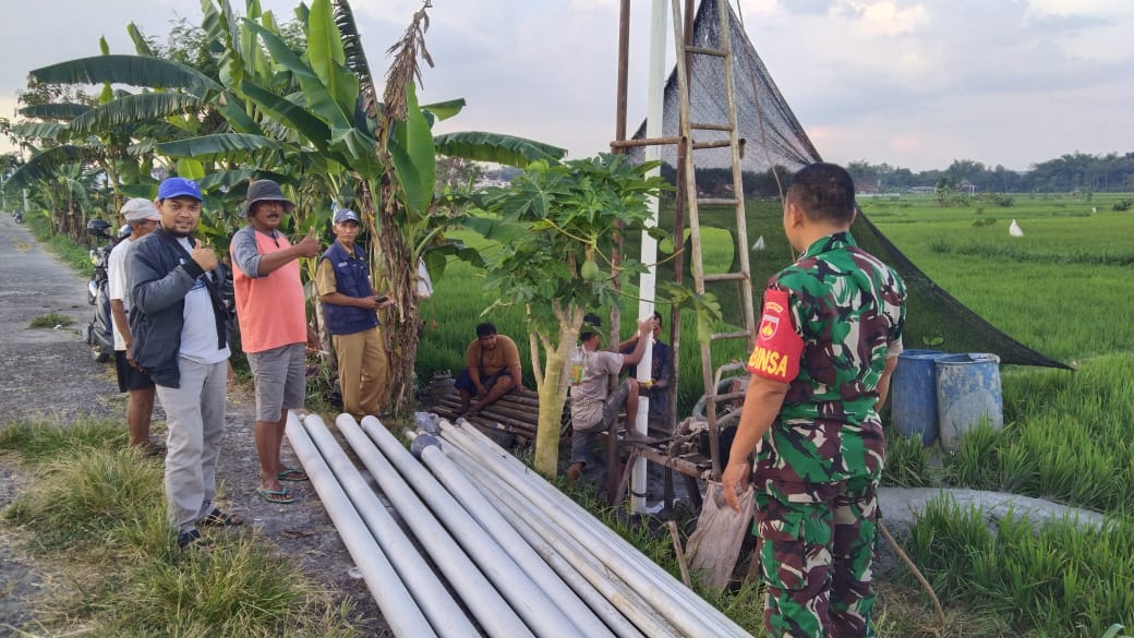 Boyolali. Babinsa Koramil 13/Nogosari Kodim 0724/Boyolali Serka Wahyono bersama Dinas Pertanian, mengecek mesin pompa air bantuan dari Kementerian Pertanian (Kementan) Irpom untuk para Kelompok Tani Raharjo Desa Glonggong Kecamatan Nogosari Kabupaten Boyolali. Rabu ( 14/05/25)