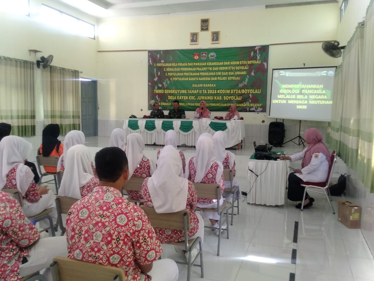 Boyolali. Satgas TMMD Sengkuyung Tahap II Kodim 0724/Boyolali TA. 2025 melaksanakan kegiatan non fisik berupa sosialisasi bela negara sekaligus sosialisasi penerimaan calon TNI AD atau biasa disebut dengan rekrutmen TNI AD kepada siswa SMK N I Juwangi Kecamatan Juwangi Kabupaten Boyolali. Kamis (15/06/25)