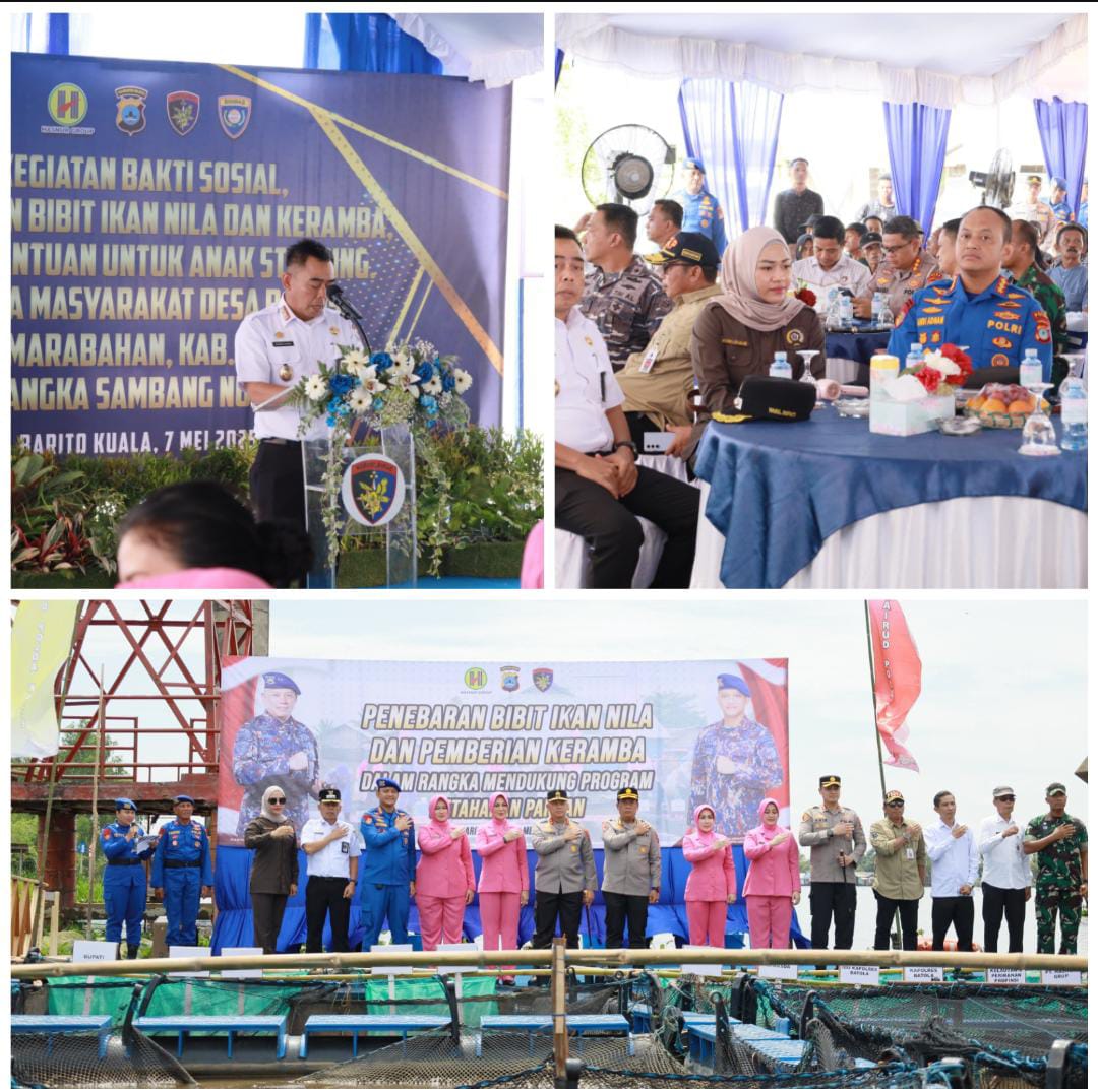 Wakil Bupati Barito Kuala Herman Susilo, menghadiri kegiatan bakti sosial Sambang Nusa Presisi yang diselenggarakan oleh Direktorat Kepolisian Perairan dan Udara (Ditpolairud) Polda Kalimantan Selatan di Desa Bagus, Kecamatan Marabahan. Kegiatan ini mendapat sambutan antusias dari masyarakat yang menerima berbagai bentuk bantuan sosial, di antaranya bibit ikan nila, keramba apung, bantuan untuk anak-anak stunting, serta paket bantuan sembako pada Rabu (7/5).