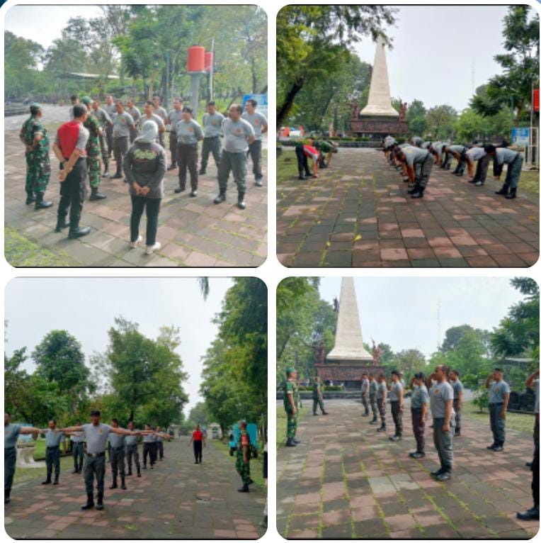 Surakarta – Babinsa Kelurahan Tegalharjo Koramil 04/Jebres Kodim 0735/Surakarta Serka Joko Riyanto dan Koptu Sanda Arieswanto bersama dengan Aiptu Joko Lebowo selaku Bhabinkamtibmas memberikan pelatihan Peraturan Baris Berbaris dan pembinaan terhadap anggota Linmas yang bertempat di Taman Monumen 45 Banjarsari, kelurahan Setabelan, Kecamatan Banjarsari, (18/05/2025).