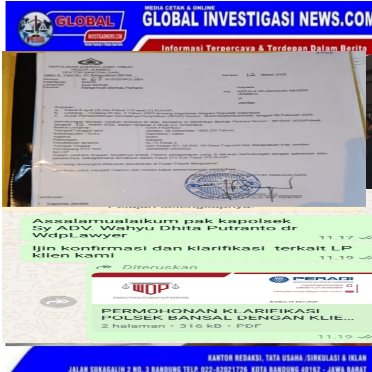 GIN, JATIM JEMBER, 19/05/2025 – Kuasa hukum Wahyu Dhita P, SH., MH menyayangkan adanya kejanggalan terkait laporan Polsek Bangsalsari bahwa telah melimpahkan edaran surat pemberitahuan penyidikan dengan Nomor B/67/111/2025/Polsek