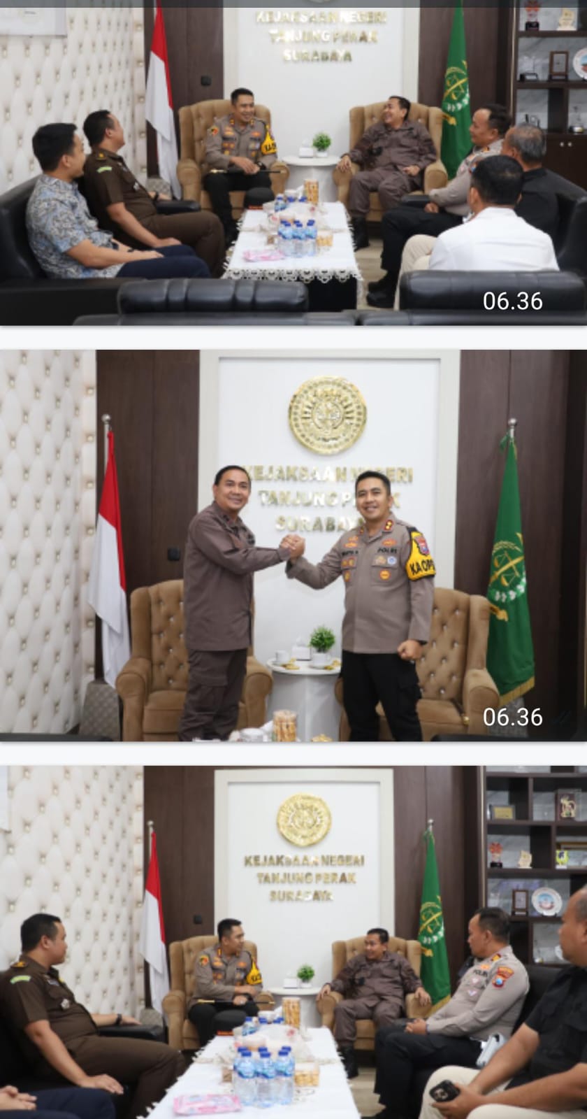 TANJUNGPERAK – Kapolres Pelabuhan Tanjung Perak, AKBP Wahyu Hidayat, SIK MH, melakukan kunjungan silaturahmi ke Kantor Kejaksaan Negeri (Kejari) Tanjung Perak Surabaya. Kedatangan Kapolres beserta jajarannya disambut langsung oleh Kepala Kejaksaan Negeri Tanjung Perak, Ricky Setiawan Anas, yang didampingi oleh Kepala Seksi Tindak Pidana Umum.
