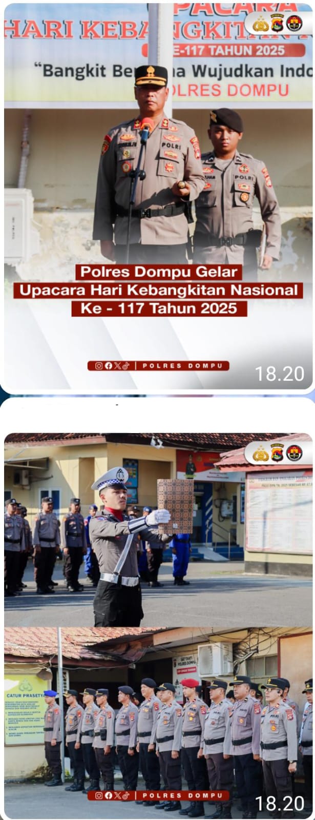 Kepolisian Resor Dompu menggelar upacara memperingati Hari Kebangkitan Nasional (Harkitnas) ke-117 tahun 2025 yang berlangsung khidmat di halaman Mako Polres Dompu pada Senin pagi, 20 Mei 2025. Upacara tersebut dipimpin langsung oleh Kapolres Dompu AKBP Sodikin Fahrojin Nur, S.I.K., dan diikuti oleh Wakapolres, para Kabag, Kasat, Kasi, perwira staf, serta seluruh anggota dan ASN Polres Dompu.