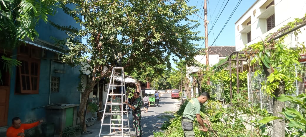 Kodim 0735/Surakarta Serka Yudha dan Serda Daryono bersama dengan anggota Linmas melaksanakan kegiatan kerja bakti pembersihan lingkungan dan perempelan ranting dan dahan pohon bertempat diseputaran Kelurahan Banyuanyar Jl. Adi Sumarmo No. 163 Kelurahan Banyuanyar,Kecamatan Bnjarsari, Selasa (27/05/2025).
