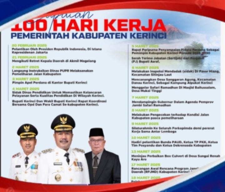 Kerinci ginewstvinvestigasiinews.com : – Pemerintah Kabupaten Kerinci di bawah kepemimpinan Bupati Monadi, S.Sos., M.Si dan Wakil Bupati H. Murison, S.Pd., S.Sos., M.Si berhasil menunjukkan berbagai capaian nyata dalam 100 hari kerja pertama mereka. Sejak dilantik oleh Presiden Republik Indonesia di Istana Kepresidenan Jakarta pada 20 Februari 2025, keduanya langsung tancap gas menjalankan berbagai program prioritas yang menyentuh langsung kebutuhan masyarakat.