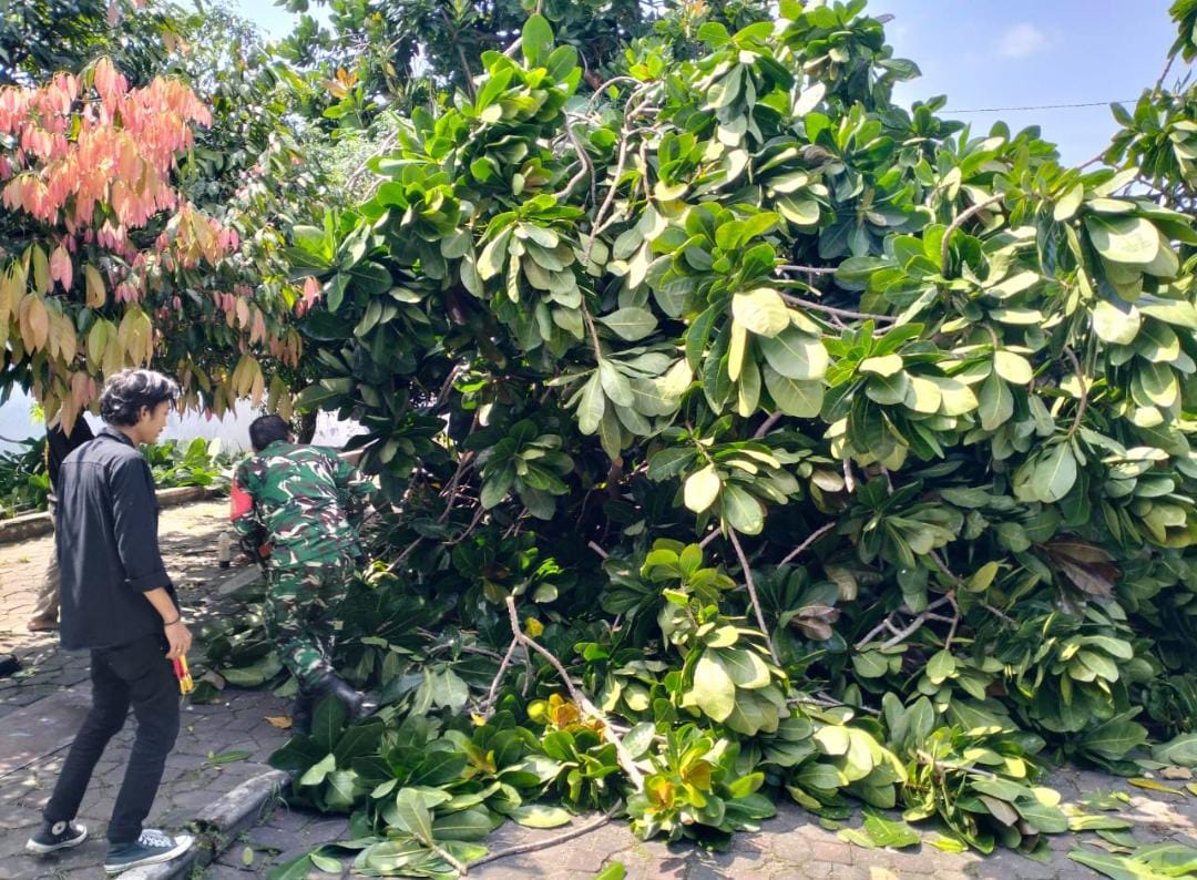 Surakarta – Babinsa Kelurahan Baluwarti Koramil 05/Pasar Kliwon Kodim 0735/Surakarta Serka Rofiq Priyono bersama dengan warga melaksanakan karya bakti memotong pohon dan membersihkan lingkungan di depan Keraton Kasunanan Surakarta Hadiningkrat Kelurahan Baluwarti Kecamatan Pasar Kliwon, Sabtu (31/05/2025).