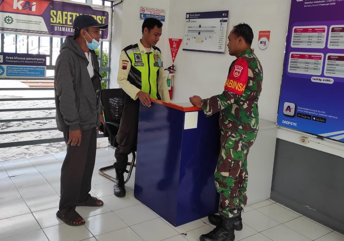 Surakarta – Babinsa Kelurahan Sangkrah Koramil 05/Pasar Kliwon Kodim 0735/Surakarta Sertu Eko dan Serda Fredi secara rutin melakukan monitoring terhadap pengamanan di Stasiun Kereta Api Solo Kota guna menjaga keamanan dan kondusifitas wilayah binaan, Minggu (01/06/2025).