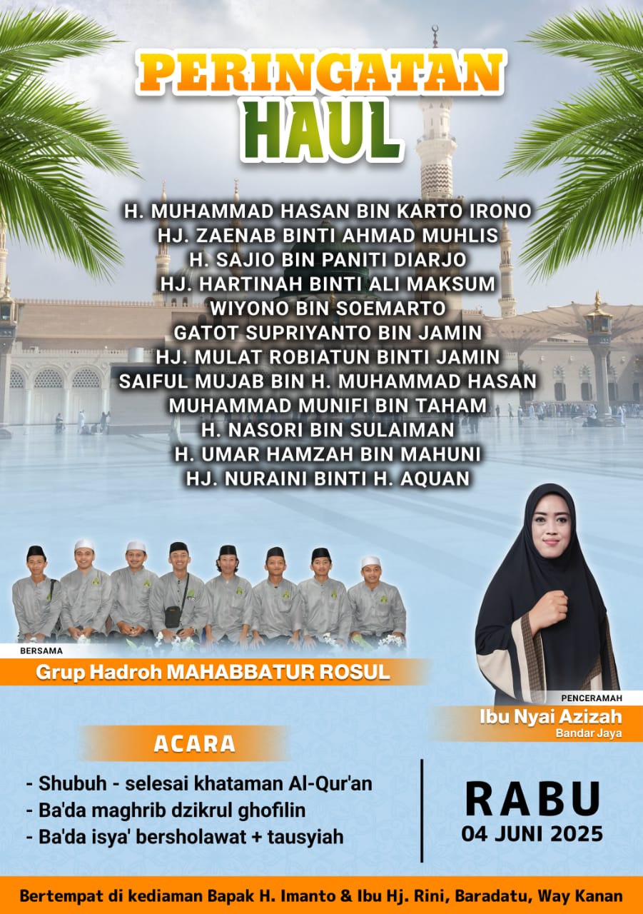Peringatan Haul H. Muhamad Hasan Bin Karto Ironi di Baradatu yang akan dilaksanakan pada hari Rabu Malam Kamis 4 Juni 2025 akan menghadirkan Penceramah Ibu Nyai Azizah dari Bandar Jaya Lampung Tengah.