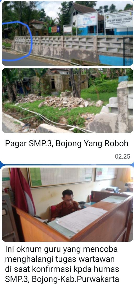 Sungguh Ironis sekali kejadian tidak menyenangkan terulang lagi kepada beberapa awak media Purwakarta saat melaksanakan tugas investigasi dan konfirmasi di SMPN 3.BOJONG di wilayah kecamatan Bojong Kabupaten Purwakarta.