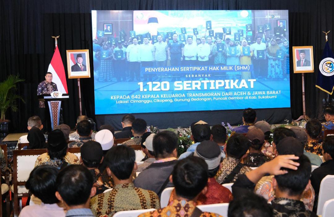 Adapun penyerahan 1.120 sertipikat ini dilakukan oleh Menko IPK, AHY, dengan didampingi Wamen ATR/Waka BPN, Ossy Dermawan, serta Menteri Transmigrasi, M. Iftitah Sulaiman. Turut hadir dalam kesempatan tersebut Wakil Menteri Transmigrasi, Viva Yoga Mauladi; Bupati Sukabumi, Asep Japar; serta para Pejabat Pimpinan Tinggi Madya dan Pratama dari kementerian/lembaga terkait. (Ben/Him)