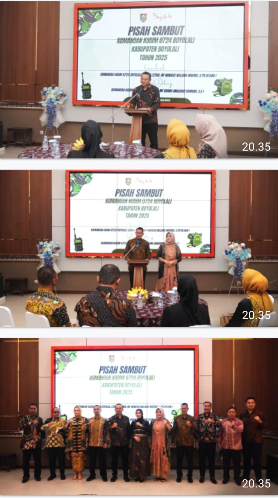 Boyolali. Bertempat di Gedung Putih Pemkab Boyolali berlangsung acara Pisah Sambut Dandim 0724/Boyolali dari Letkol Inf Wiweko Wulang Widodo, S.Pd.M.Han kepada Letkol Inf Dhanu Anggoro Asmoro, S.E.bersama Forkompimda, Tokoh Agama dan Tokoh masyarakat Kabupaten Boyolali, (21/6/2025)