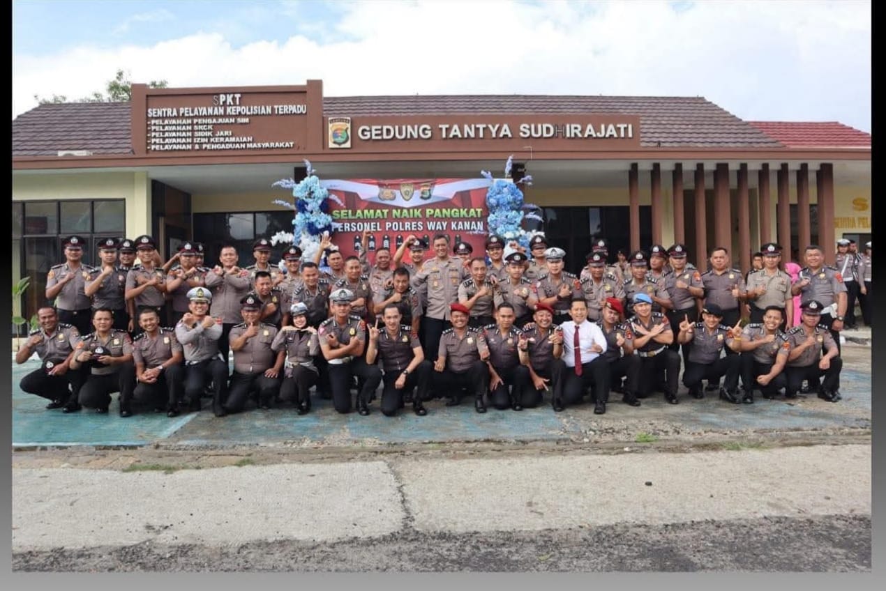 Sebanyak 44 personel Polres Way Kanan Polda Lampung dinaikan pangkat setingkat lebih tinggi pada acara Upacara Laporan Kenaikan Pangkat yang dipimpin oleh Kapolres Way Kanan AKBP Adanan Mangopang, di Mako Polres Way Kanan. Senin (30/06/2025).