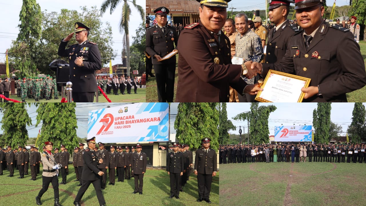 Kapolres AKBP Adanan Mangopang bertindak selaku inspektur upacara membacakan sambutan dari Kepala Kepolisian Negara Republik Indonesia Jenderal Polisi Drs. Listyo Sigit Prabowo, M.Si. bahwa dalam rangka upacara dan syukuran peringatan Hari Bhayangkara ke-79 tahun 2025.
