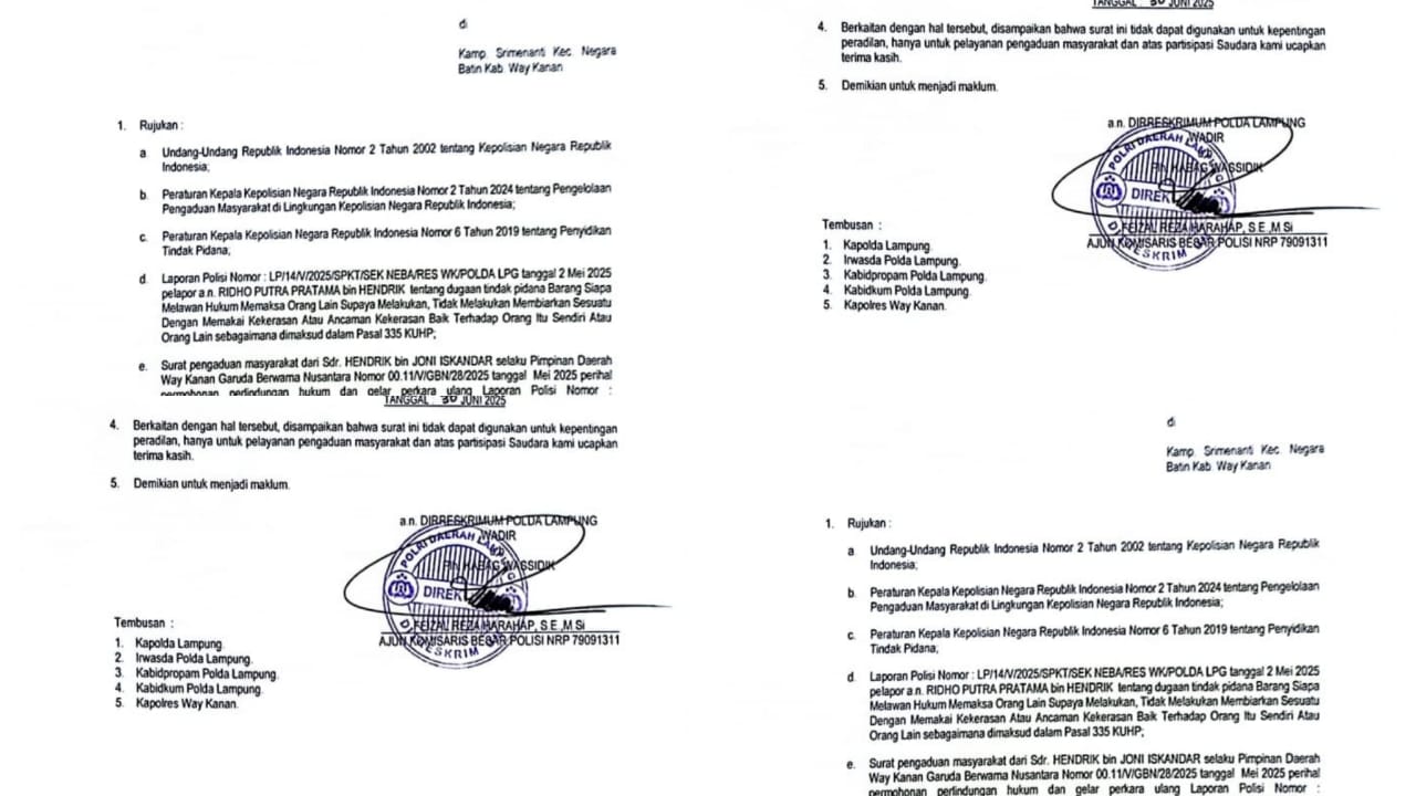 Hal tersebut tertuang dalam Surat Pemberitahuan Perkembangan Penanganan Dumas (SP3D) Nomor: B/588/VI/RES.7.5/2025/DITRESKRIMUM tertanggal 30 Juni 2025. Surat tersebut ditandatangani oleh AKBP Feizal Reza Harahap, S.E., M.Si., selaku Wadir/Kabag Wasidik Ditreskrimum Polda Lampung.