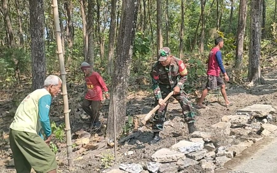 Boyolali – Babinsa Koramil 18/Kemusu Kodim 0724/Boyolali, Kopka Budi Suryanto, bersama warga melaksanakan kerja bakti memperbaiki jalan rusak di Dukuh Serut, Desa Kedungrejo, Kecamatan Kemusu, Kabupaten Boyolali, pada Selasa (08/07/25).
