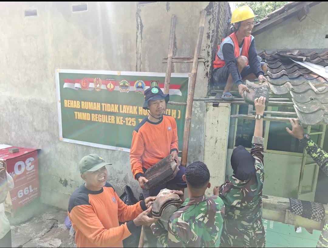 “Anggota TNI yang tergabung dalam Satgas TMMD bersama-sama dengan warga masyarakat melaksanakan pembongkaran atap rumah dilanjutkan dengan proses pengerjaan renovasi.”tuturnya.