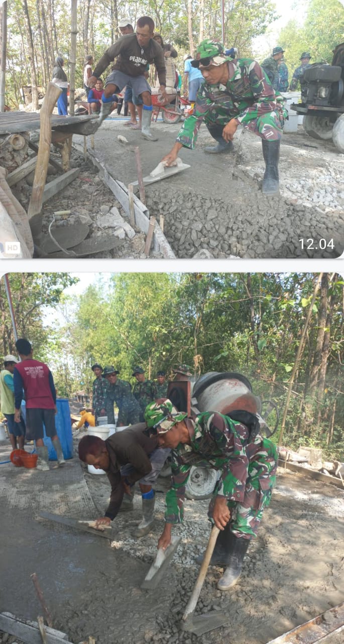 Dengan penuh semangat, para anggota Satgas bersama warga memainkan roskam—alat gosok sederhana dari kayu—untuk meratakan dan menghaluskan material cor. Aktivitas ini menjadi pemandangan yang menggambarkan kerja keras dan sinergi nyata antara TNI dan masyarakat.