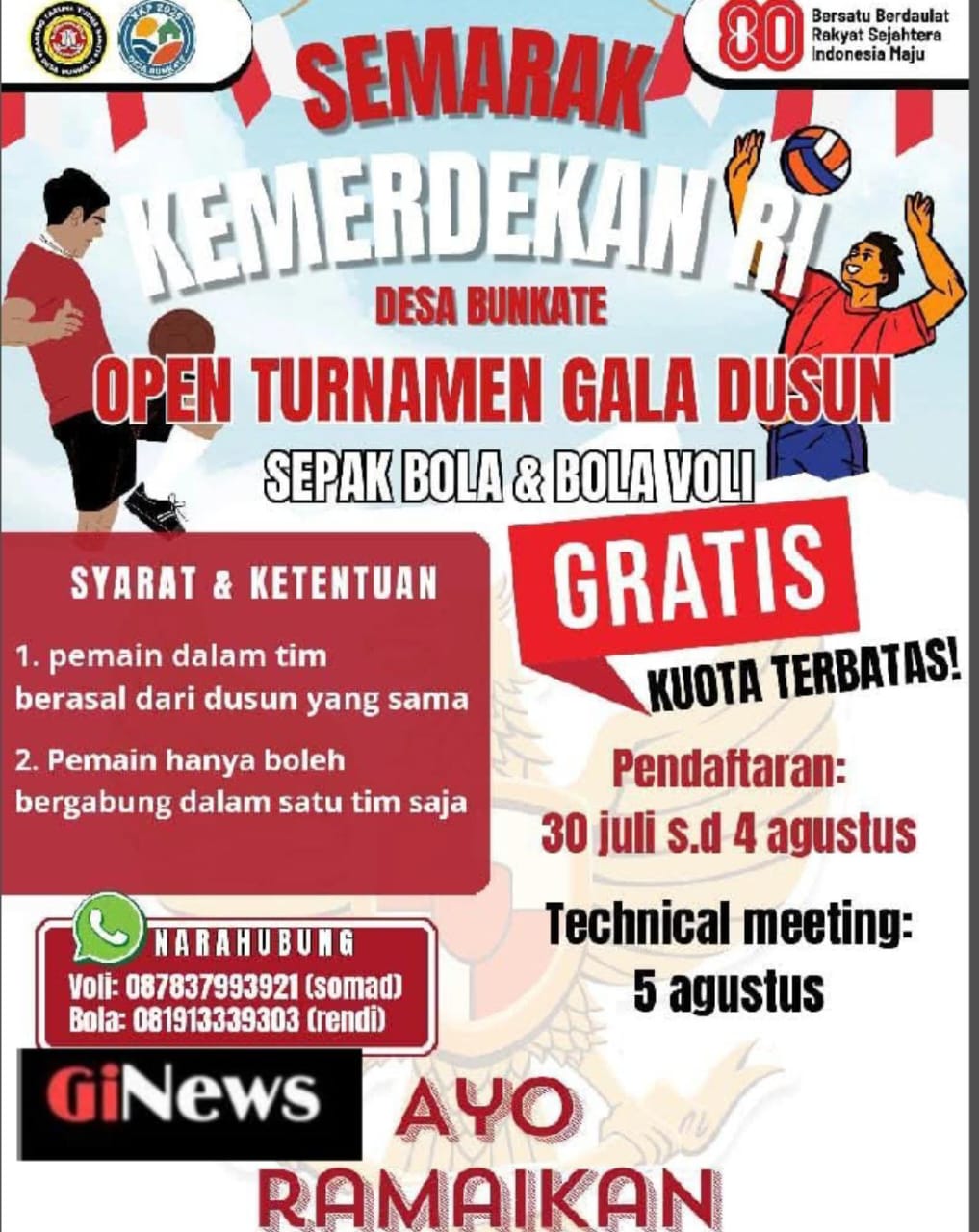 Kepala Desa Bunkate Maris S.Sos, mengatakan, dalam rangka memeriahkan HUT RI Ke-80, Pemerintah Desa Bunkate bekerjasama dengan Karang Taruna Desa Bunkate mengadakan turnamen sepak bola dan Bola Voli antar Dusun. Kegiatan ini juga untuk menjalin silaturahmi antar warga dengan Pemerintah Desa.
