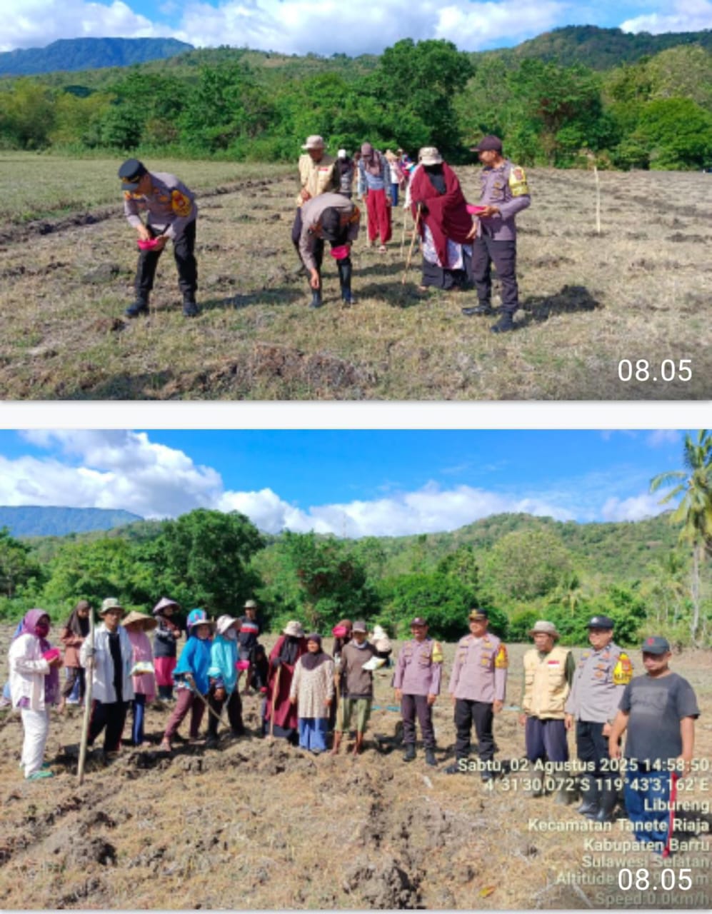 Mendukung program ketahanan pangan nasional tahun 2025, Polsek Tanete Riaja Polres Barru melaksanakan penanaman jagung musim tanam kuartal III di Dusun Ulo, Desa Libureng, Kabupaten Barru, (2/8/25).