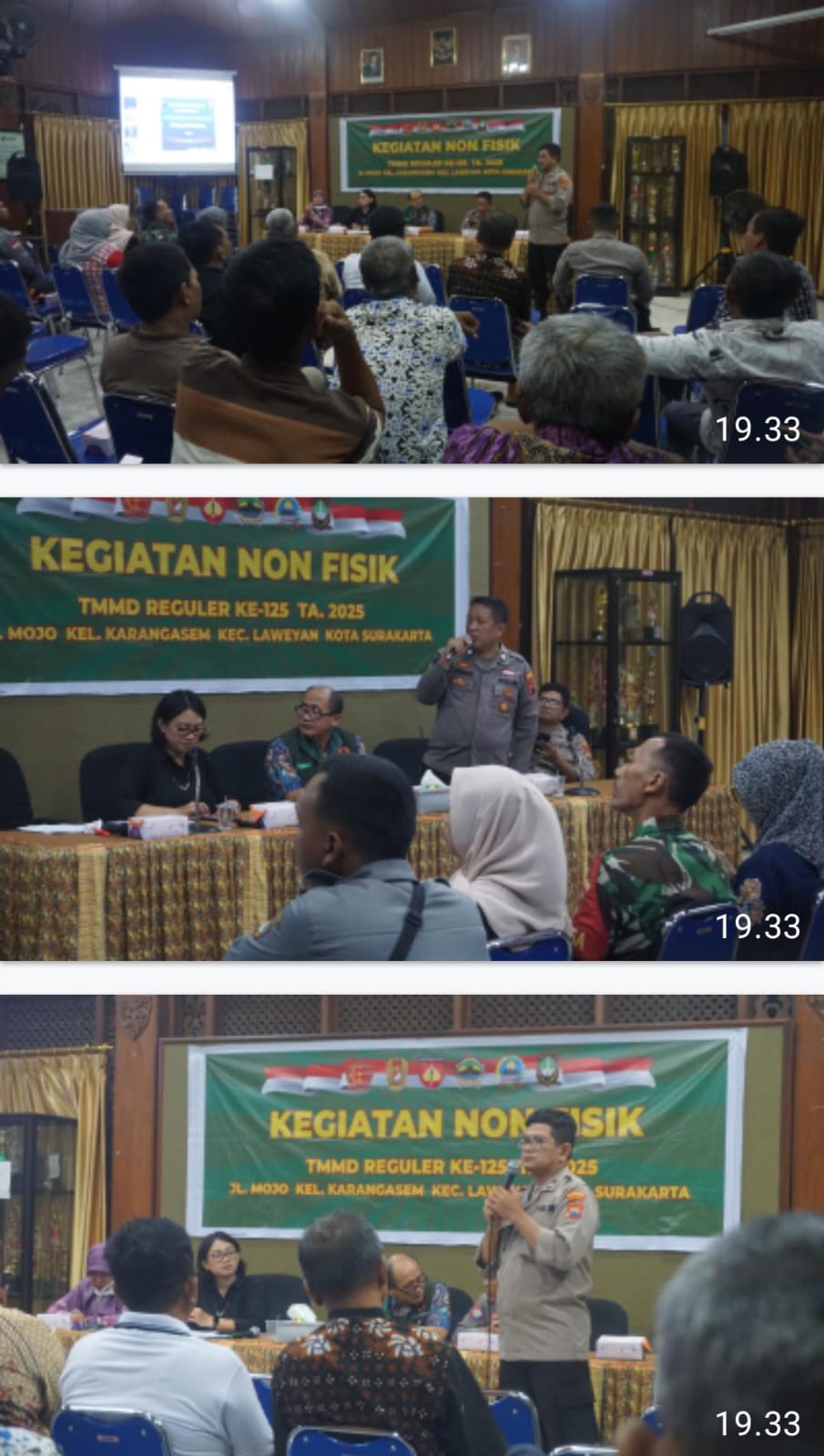 Penyuluhan Hukum dan Kamtibmas tersebut digelar sebagai bagian dari Program sasaran non fisik TMMD ke 125 tahun 2025 bertempat di Pendopo Kelurahan Karangasem , Kecamatan Laweyan, Minggu (10/8/2025).