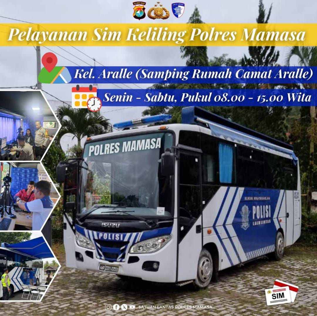 www.global investigasi news.com.Satuan Lalu Lintas (Satlantas) Polres Mamasa kini menyediakan layanan SIM keliling di kecamatan aralle untuk memudahkan masyarakat dalam mengurus perpanjangan Surat Izin Mengemudi (SIM). Layanan ini tersedia mulai hari Senin tanggal 25 Agustus -30 Agustus 2025 mulai pukul 08.00 hingga 15.00 WITA, bertempat di samping rumah camat aralle.