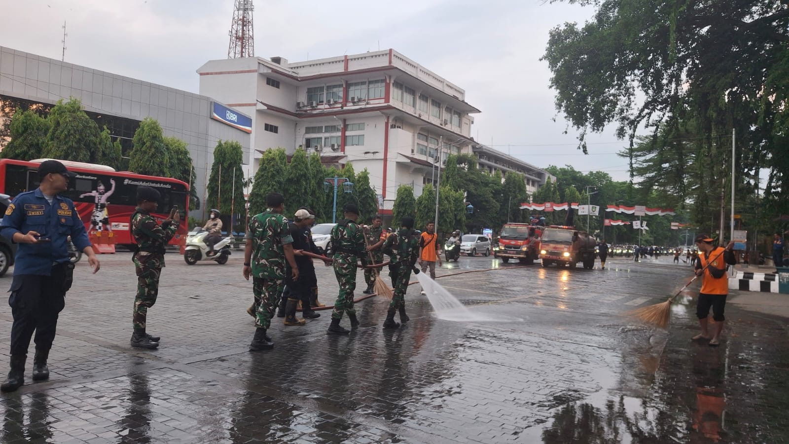 Surakarta – Dalam rangka membersihkan jalan dari debu pasca demonstrasi di depan kantor Balaikota Surakarta, Kodim 0735/Surakarta bekerja sama dengan Dinas Pemadam Kebakaran (Damkar) Kota Surakarta dan warga masyarakat melaksanakan kerja bakti penyemprotan jalan, Senin (01/09/2025).