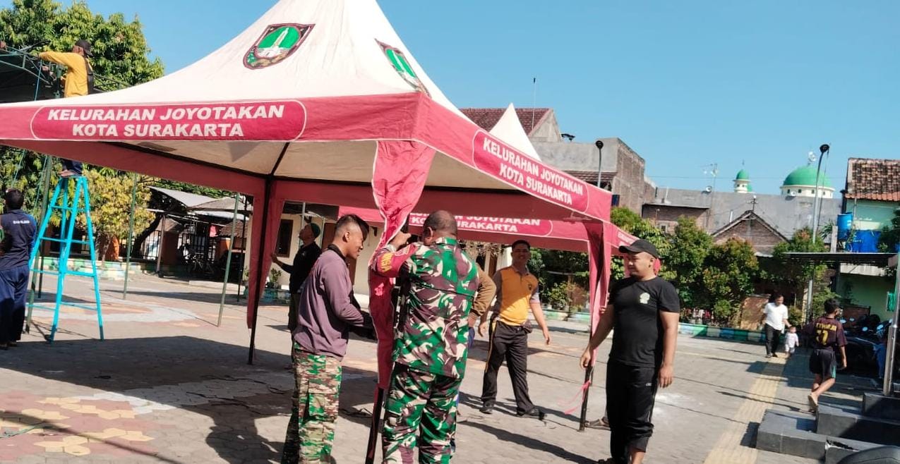 Surakarta, Babinsa Joyotakan Koramil 03 Serengan Kodim 0735 Surakarta Serka Rumbawa dan Bhabinkamtibmas Aipda Fajar dan Linmas melaksanakan kegiatan Pelatihan Pemasangan Tenda Darurat antisipasi bencal bertempat di taman cerdas Joyotakan Serengan Kota Surakarta, 19/09/2025