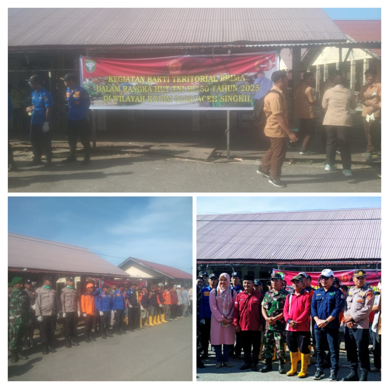 Dalam rangka Karya Bakti Personil Tentara Nasional Indonesia (TNI) Kodim 0109/Aceh Singkil, menyambu Hut TNI ke 80, Camat Singkil, Khairuddin, SE dan staf ikut pada pelaksanaan pembersihan lokasi Pajak Mingguan (Pasar Senin).
