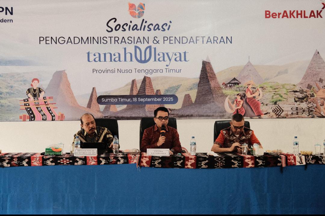 SUMBA TIMUR – Global investigasi News.com – Kementerian Agraria dan Tata Ruang/Badan Pertanahan Nasional (ATR/BPN) terus mendorong percepatan pendaftaran tanah ulayat sebagai bentuk perlindungan hak masyarakat hukum adat. Upaya ini diwujudkan melalui kegiatan sosialisasi Pengadministrasian dan Pendaftaran Tanah Ulayat yang berlangsung di Desa Tandula Jangga, Kabupaten Sumba Timur, pada Kamis (18/09/2025). Staf Khusus Bidang Reforma Agraria, Rezka Oktoberia, menegaskan bahwa manfaat sertipikasi tanah ulayat tidak terbatas bagi masyarakat hukum adat saja.