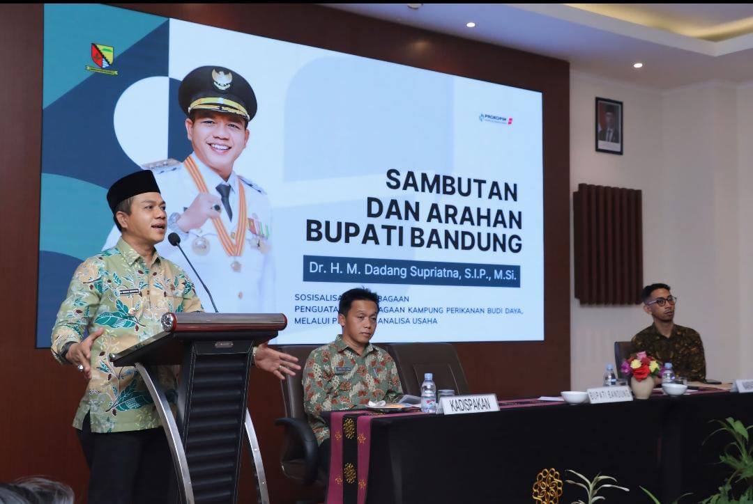 KAB. BANDUNG – Bupati Bandung Dadang Supriatna menghadiri sekaligus membuka kegiatan sosialisasi kelembagaan dalam upaya penguatan kelembagaan kampung perikanan budidaya melalui pelatihan analisa usaha di Hotel Grand Sunshine Kecamatan Soreang Kabupaten Bandung, Kamis (25/9/2025).