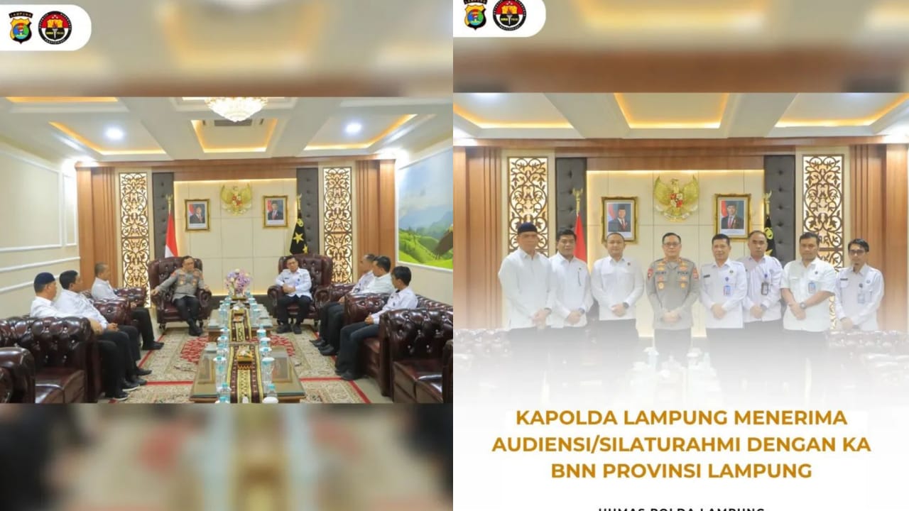 Pada hari Senin, 6 Oktober 2025, Kapolda Lampung Irjen Pol. Helmy Santika, S.H., S.I.K., M.Si. menerima kunjungan audiensi/silaturahmi dari Kepala BNN Provinsi Lampung, Kombes Pol. Sakues Ginting, S.I.K., M.H., bertempat di ruang tamu Kapolda Lampung.