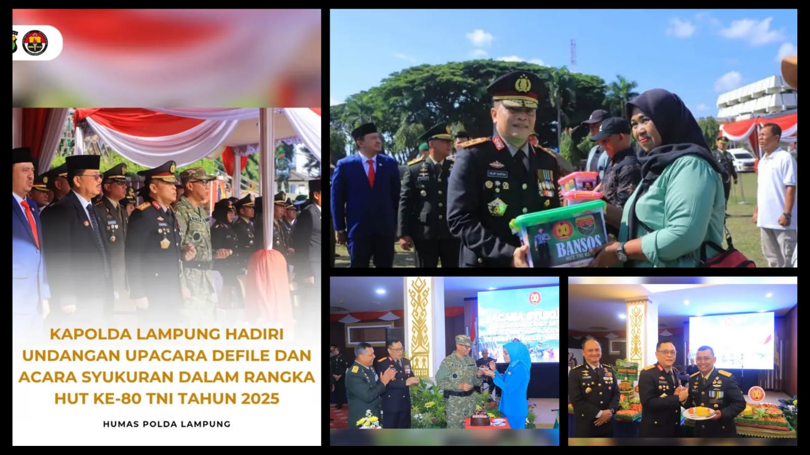 Pada hari Minggu, 5 Oktober 2025, bertempat di Lapangan Korpri Pemprov Lampung, Kapolda Lampung Irjen Pol Helmy Santika dan Wakapolda Lampung Brigjen Pol Dr. Ahmad Ramadhan, menghadiri Upacara Defile dan Acara Syukuran dalam rangka HUT Ke-80 TNI.