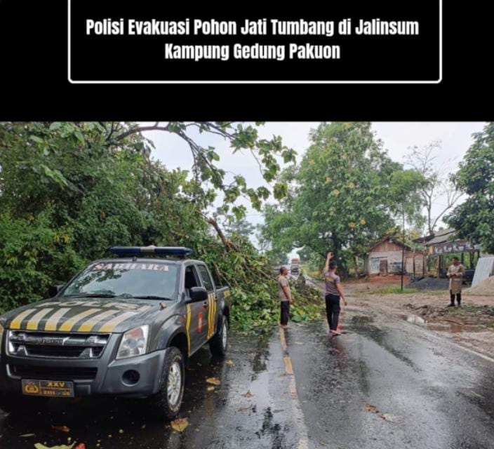 Diduga hujan lebat disertai angin kencang sebuah pohon Jati tumbang di tengah Jalan Lintas Sumatera (Jalinsum) Kampung Gedung Pakuon Kecamatan Baradatu Kabupaten Way Kanan. Selasa (07/10/2025).
